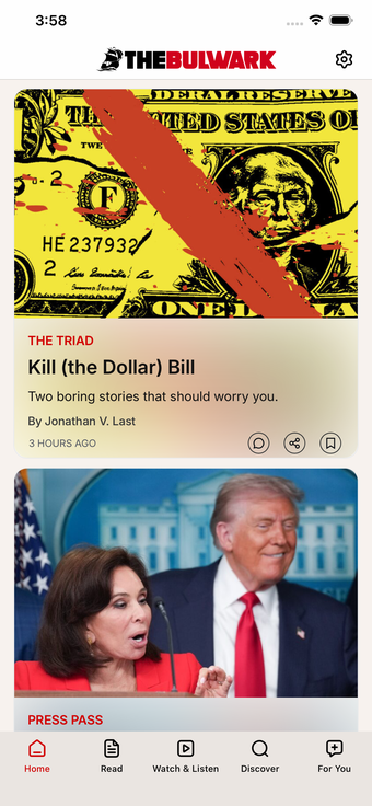 Bulwark 앱은 Bulwark+ 회원을 위해 설계되었으며, 기사, 팟캐스트 및 비디오를 포함한 다양한 미디어 형식에 접근할 수 있는 광고 없는 공간을 제공합니다. 주요 기능으로는 오디오 재생을 위한 '나에게 읽어주기' 옵션, 개인화된 '당신을 위한' 피드, 나중에 콘텐츠를 저장할 수 있는 기능이 포함되어 있습니다. 또한 사용자는 오디오 전용 버전의 프로그램을 즐기고, 텍스트 크기를 조정하며, 맞춤형 읽기 경험을 위해 다크 모드로 전환할 수 있습니다.